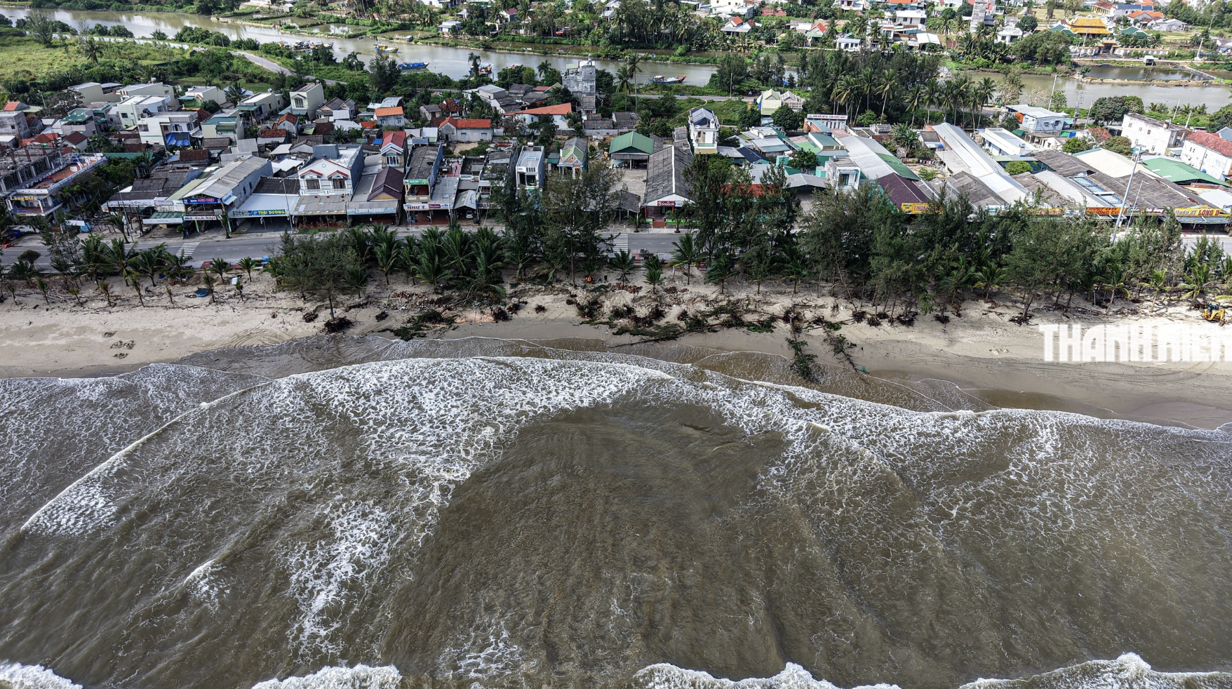 Triều cường kết hợp sóng lớn đã xâm thực nghiêm trọng bờ biển Mỹ Khê (xã Tịnh Khê, tỉnh Quảng Ngãi) làm sạt lở bờ cát, quật ngã hàng dương, đe dọa đường dân sinh và ảnh h...